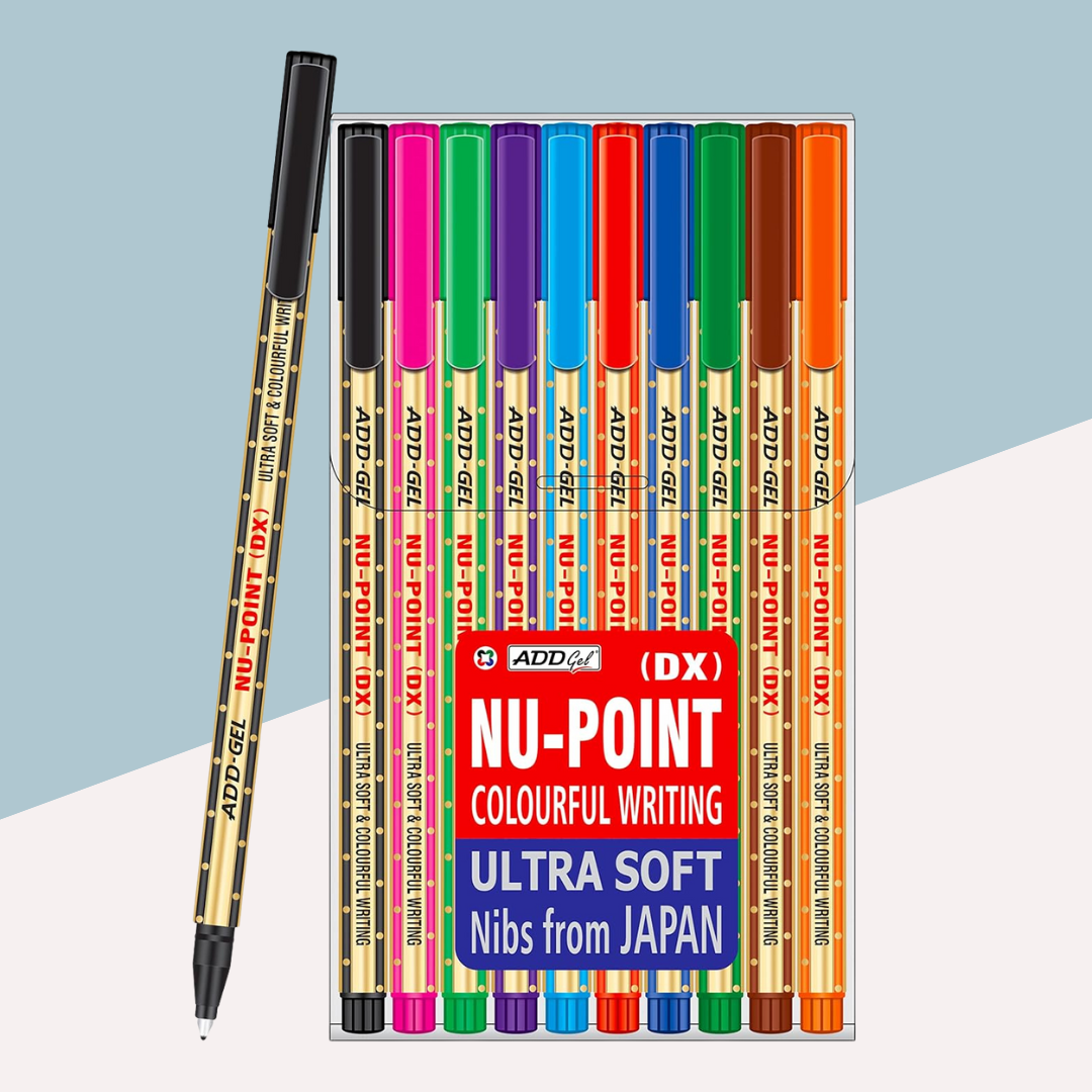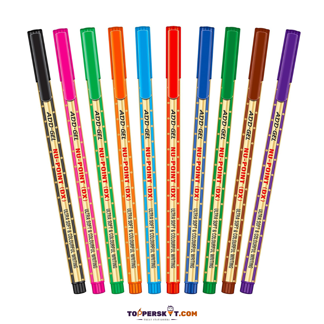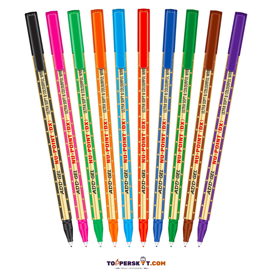 Discover the Add Gel Nu Point DX Pen – a pack of 10 pens with sleek, ergonomic designs for a comfortable grip. Enjoy smooth, effortless writing with bold multicolour ink and a precision tip for neat results. Durable plastic build ensures long-lasting use. Perfect for professional, academic, and personal tasks. SKU: 8901667844634. Portable and reliable for superior writing performance anywhere.