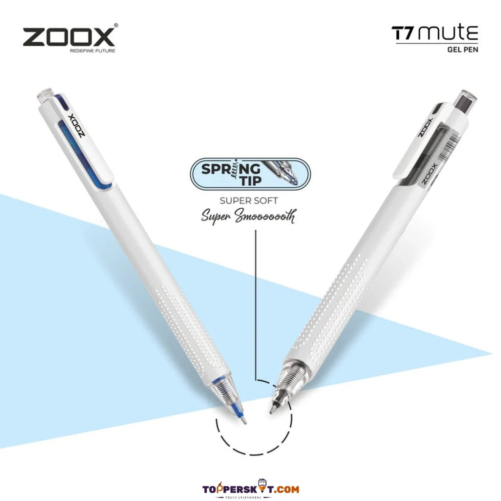 Experience smooth and silent writing with the Zoox T7 Mute Blue Gel Pen. Features a silent click mechanism, spring tip for precision, and a comfortable studded grip. Perfect for students and professionals. SKU: 8901765096500.